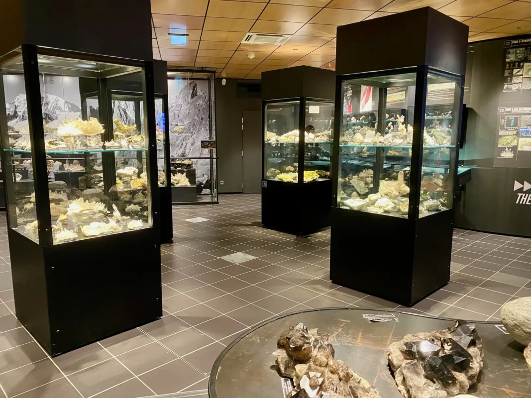 Leur travail est mis en lumière dans une scénographie moderne où les vitrines étincellent de fluorines, quartz fumés, améthystes et calcites, parmi les plus belles du monde.