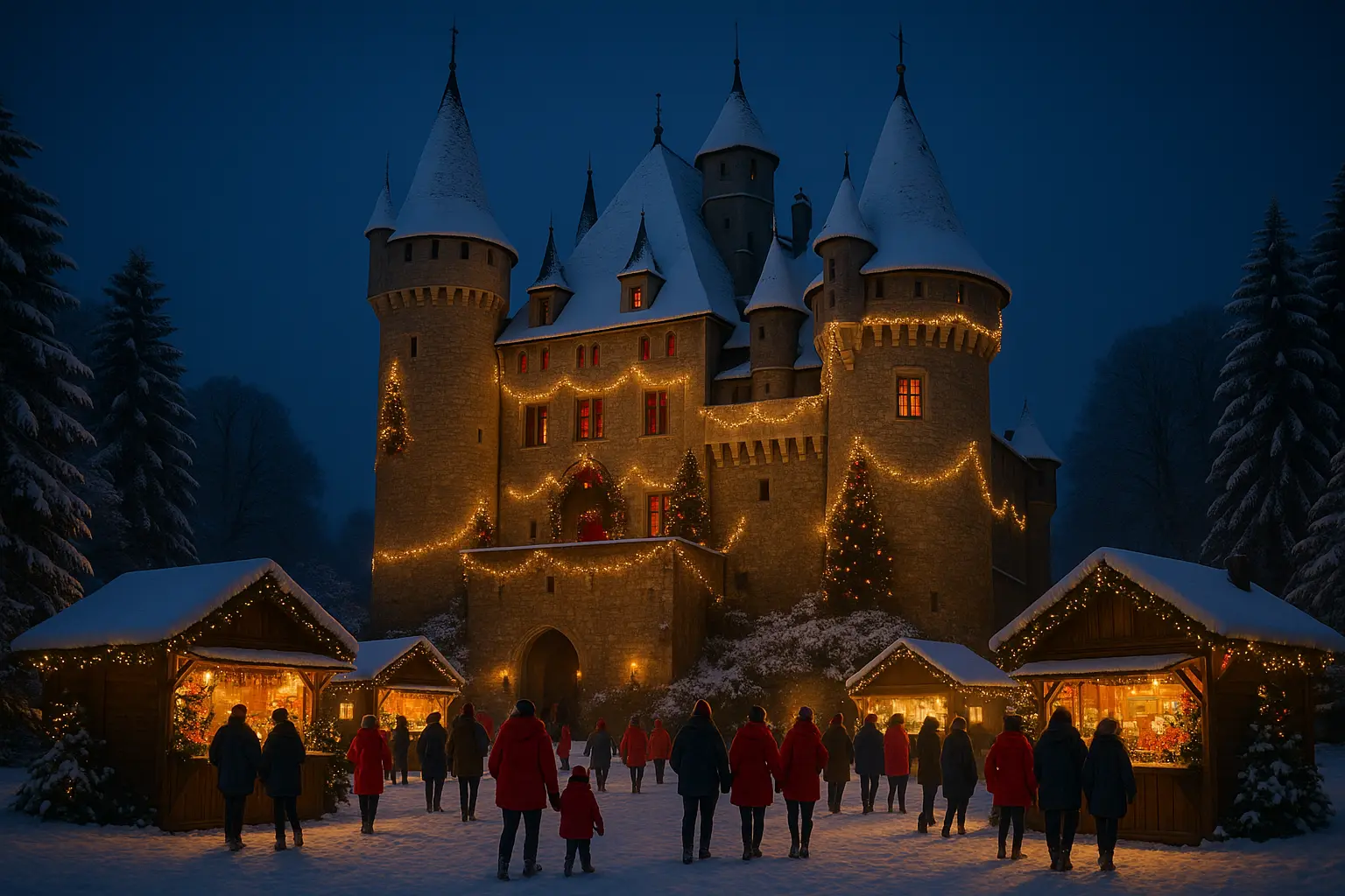 The castle opens its doors from November 14, 2025, to January 3, 2026. Enjoy a magical atmosphere with sparkling lights and the scents of gingerbread. Entry is free from 6:00 PM, ideal for a magical night stroll.
