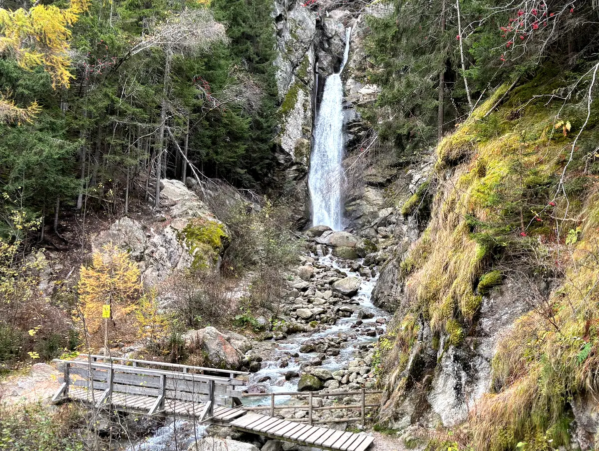 The walk begins on the road to the Mont Blanc tunnel. A small path descends into the forest, carpeted with golden leaves. At first, you hear a distant rumble, then the sound grows louder as you go forward. The Dard waterfall suddenly appears, emerging from a rocky crevice and plunging into a deep green basin.