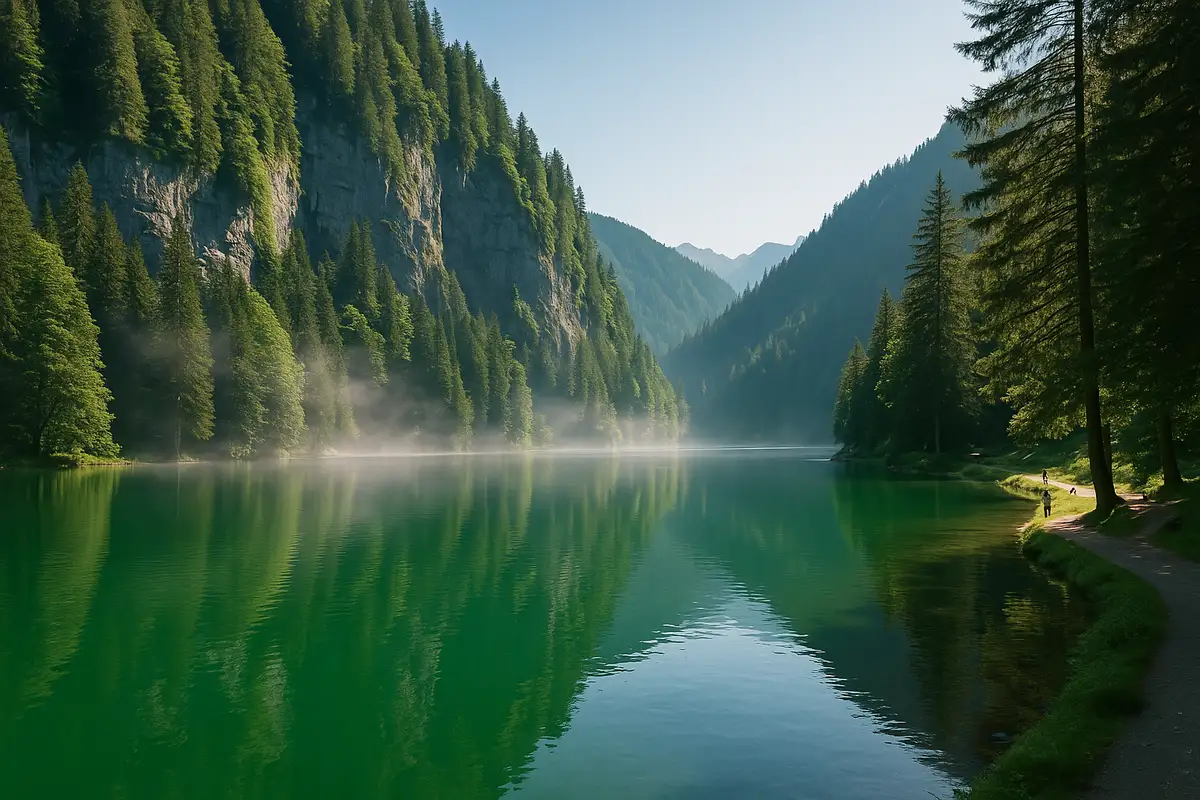 The path suddenly widens, the freshness becomes more noticeable… and there, the scenery unfolds. An emerald green lake bordered by rocky walls, as if cut out of a Nordic dream. No road circles it, just a peaceful trail, accessible to all, and a silent, almost solemn atmosphere. Some days, a light fog rises above the surface, like a veil laid over a place too beautiful to be true.