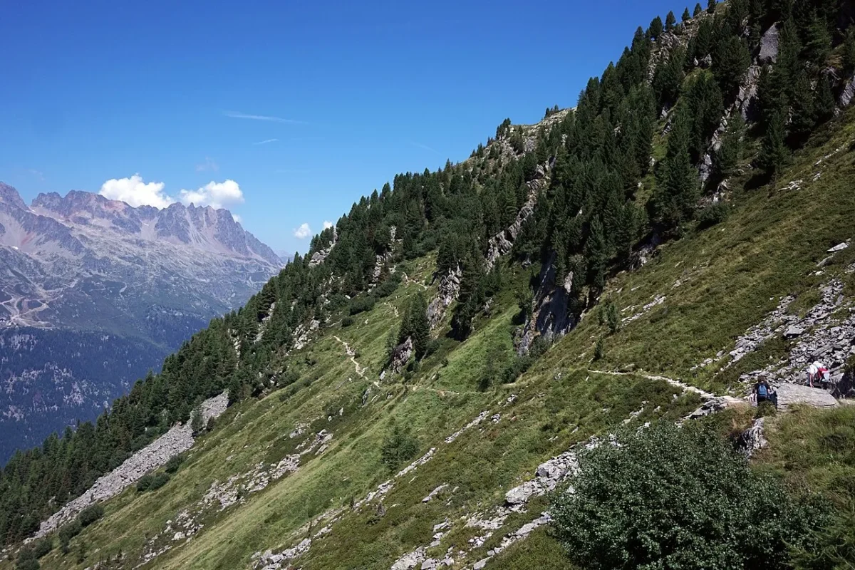 Depuis le centre de Chamonix, situé autour de 1 040 mètres d’altitude, le sentier grimpe à travers les forêts de mélèzes et de pins, longe plusieurs torrents issus des glaciers puis traverse des zones de blocs rocheux et de moraines. À mesure que l’on monte, les célèbres aiguilles de Chamonix se dévoilent peu à peu : Aiguille de Blaitière, Aiguille du Plan, Aiguille du Midi et les autres sommets voisins composent un décor de plus en plus spectaculaire à chaque lacet.