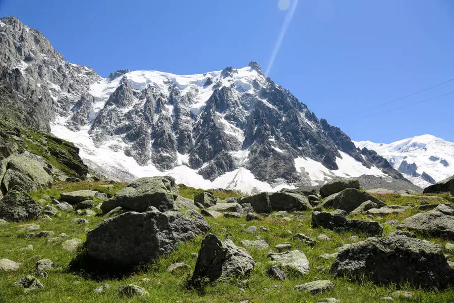 À l’arrivée, la vue sur le glacier des Bossons impressionne particulièrement. Ce glacier, connu pour ses fortes pentes dans sa partie supérieure, descend directement depuis les hauteurs du massif du Mont-Blanc. Face à vous, la face nord-ouest du Mont-Blanc se dresse dans toute sa verticalité, offrant une scène d’une puissance exceptionnelle.
